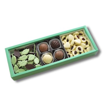 ミントグリーンのオリジナルBOX入り、チョコレート2種類とトリュフのお詰め合わせ。
