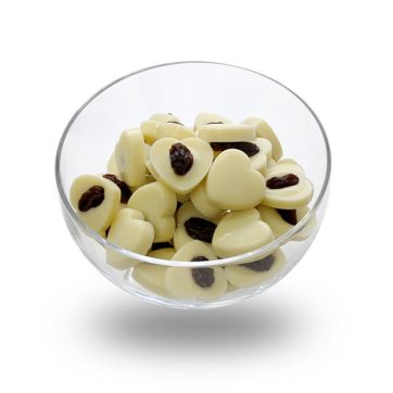 ラム酒漬けにしたレーズンをかわいらしいハート形のホワイトチョコレートの上にのせました。