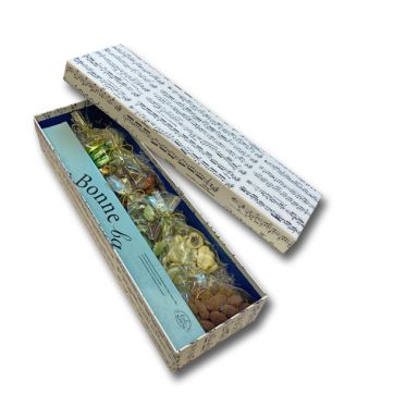 細長いお箱にマ・ボンヌ バーと、ミント、ラム・レーズン、ピエール、ブラックアーモンド、ディアモンを少しずつお詰合せいたしました。