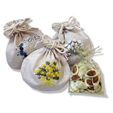 刺繡がされたサシェに、期間限定のホワイトアーモンドをおつめしました。